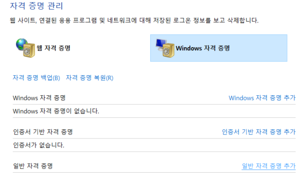 따라서 아래와 같은 방법으로 window 자격 증명이 제대로 설정되어 있나 확인한다.