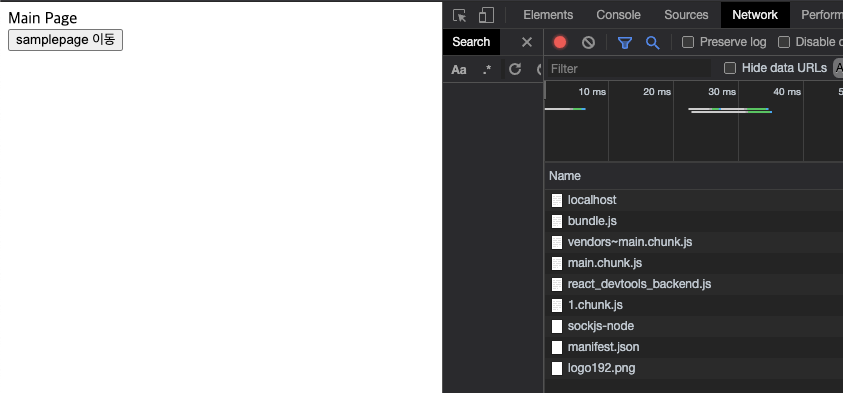 아까 전과 다르게 SamplePage로 이동하면 0.chunk.js 와 2.chunk.js파일이 페이지 이동과 함께 불러와지는 걸 확인할 수 있다.