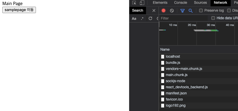 확인해보면 번들링 된 파일이 나눠져 있지 않기 때문에 처음 MainPage에서 모두 로드되어 SamplePage로 넘어가도 다른 js파일이 로드되지 않는 걸 볼 수 있다.