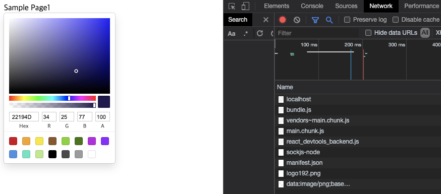 하나의 번들링 된 js파일에 SamplePage1에 사용된 react-color가 있는 것을 확인할 수 있다.